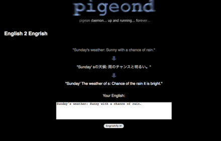 English to Engrish this one uses the babelfish translator (like the name implies), through which it recycles the input text. What makes this one really interesting is that it also displays the Japanese word and the process how it got to the end result. Funny, this is probably how many engrishness comes to be: somebody at the other end is using Babelfish or Google translator.