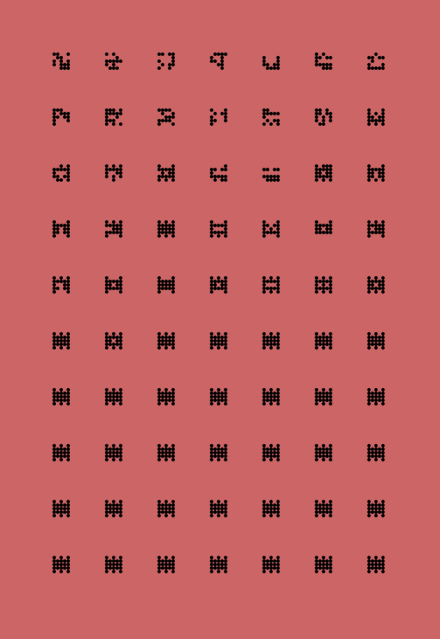 Changing the genetic carpet from drawing pixels to drawing connected lines produce some exciting webs. A smaller interspaced 5 × 5 grid creates some fun space invaders. The fitness function quite quickly decides on a best fit for symmetry. All the images here display the best child of each generation.
