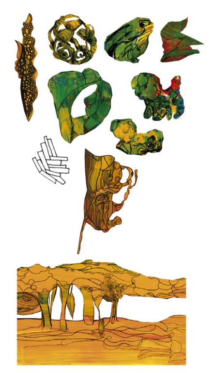 I haven’t gotten very far with the technical side of the dream diary and have been thinking about the elements and categories. Therefore I decided to make coincidental art with NodeBox in ways that I have learnt, using parts from my paintings and drawings. I extracted little parts from larger very detailed works and coincidentally things came out that weren’t there originally! I’m always doing that when I’m drawing, things just start to appear (similar to broccoli heads) on the paper/canvas… So in the middle of a painting full of plants and colours, I found puppies, a frog and a tree spirit, at least that’s what they look like to me - something trippy that might be part of a children’s book illustration. I used paths drawn in Illustrator (following some lines of the background forest) to place the elements, so they vary and can be made into a movie (there are two examples with pretty much the same script):