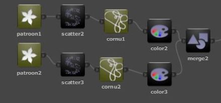 Vandaag zijn we weer verder gegaan met onze snus-bril-amoebe.<div>Bij de delaunay die voor de lijnen in de bril zorgden, werkte de seed parameter niet, aangezien de buitenlijnen van de bril altijd dezelfde blijven (bij verandering van de omtrekvorm veranderen de lijnen wel). Een eerste suggestie die ons werd aangereikt was een snap-node. Die zorgde voor beperkte variatie bij de lijnen. Later kwam de suggestie om scatter en resample nodes toe te voegen. Die boden veel meer mogelijkheden, aangezien dat er punten in het brilglas-oppervlak werden gezet, waardoor de delaunay-node meer variatiemogelijkheden kreeg.</div><div>Door random functies toe te voegen aan de scatter (bij de delaunay) en cornu functies konden we de snor en de lijnen in de bril laten variëren. De place-node zorgde voor de verschillende random variabelen bij de verschillende versies.</div><div>