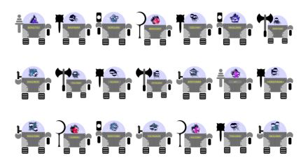 Lichaam: verschillende naamplaatjes, wapens, patroon en kleur op dijen