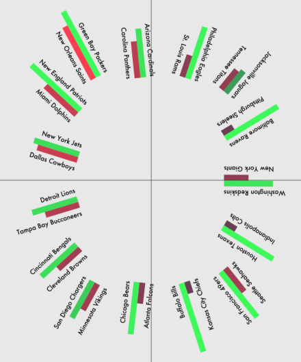 Gegevens van 2011. <div>Visualiseren welk team wint en wie er verliest + hoeveel yards zij hebben behaald.</div><div></div>