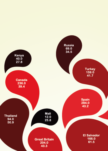 </div><div>Elke druppel heeft zijn unieke kleur en grootte naargelang de informatie die er zich in bevindt. Zo hangt de kleur van de druppel af van de hoeveelheid Cola er in een land geconsumeerd wordt terwijl de grootte dan weer aangeeft wat de HPI van een land is.</div><div>