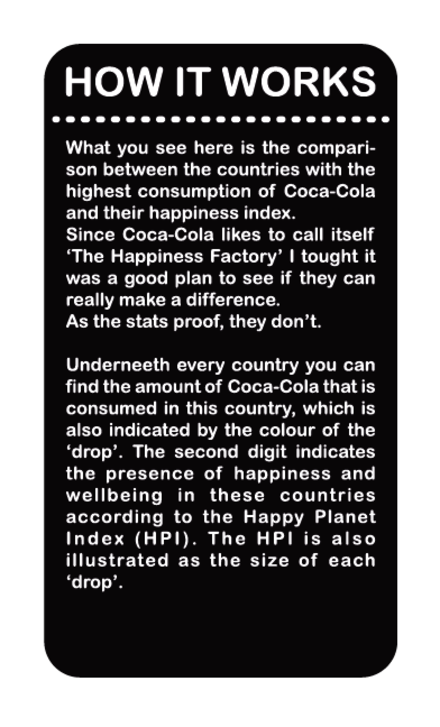 Mijn poster maakt een visuele vergelijking tussen de hoeveelheid Coca-Cola die in een land geconsumeerd wordt en de Happy Planet Index die het geluk en welzijn van mensen in die landen opmeet.<div>Vermits Coca-Cola zich wel eens ‘The Happiness Factory’ noemt, leek me het leuk om te kijken of ze ook werkelijk een impact hebben op het geluk in een land.</div><div>De resultaten maken duidelijk dat het niet zo is.</div><div>