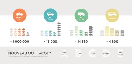Our initial sketch showed a 3rd graphic, which is not included in the final poster. The main reason is because we didn’t estimate correctly the space the title and the main graphic would take, but also because there was some problems with what we wanted to represent and the datas. Since this last graphic was about driver’s gender (still by type of vehicles), the gap between the datas was HUGE. For example, looking at all the men driving passenger cars, we had a number that looks like 987654325689877459877… and looking at women driving trucks, we had data like 0,2… So… pretty hard to deal with, even more if with have a really restricted area. We just decided to focus on the final result instead of messing up with Nodebox, and probably get something that wouldn’t fit the small space we had left.