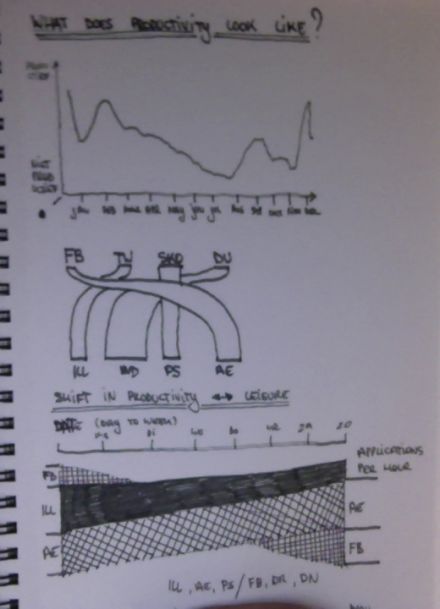 A selection of programs (productive) and websites (distracting) are put in a graph were they are compared in fields of time spent and days approaching deadline. The programs or websites that are used most are used most are on top of the graph and vice versa.