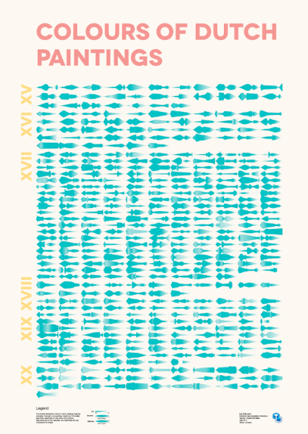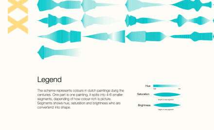 This poster represents whole map of colours in dutch paintings during the centuries. It also shows which century is most rich by paintings in galleries of Netherlands. Each separate part shows one work of art and segmets size and brightness depends on the coulours of picture. Now you can see duch paintings colours convertion into shapes.