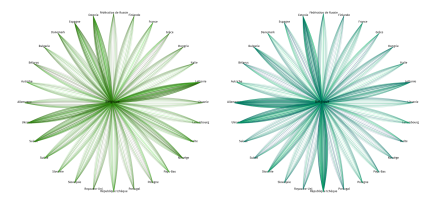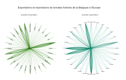 Représentation de l’importation et l’exportation de tomates fraîches en Belgique. Comparaison entre l’importation et l’exportation via deux cercles comprenant des valeurs en fonction des années.