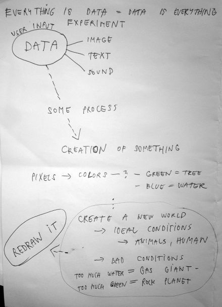 Second idea is more experimental and not very clear. I really like the theme everything is data, so I would extract from any data some information and then build something new based on them. For example new worlds. It could be nice to let people try to find ideal data to create life for example… maybe from sketch, it is more understandable.