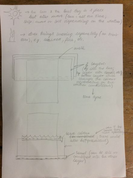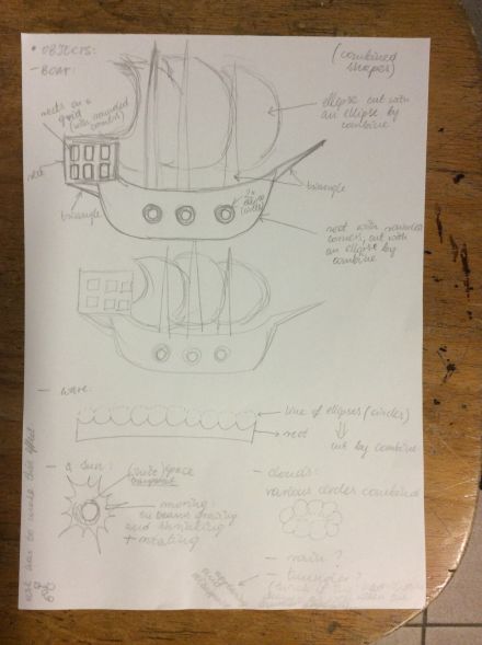 Sketches for my first idea - animation with a boat and some other elements.