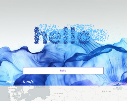 It’s a typeface responding to a weather data: wind speed and bearing in particular. According to this data, we can see particles changing their speed and direction and hear the wind sound louder or silent in different parts of the World.